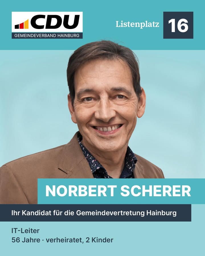 👉 Weil es um Hainburg geht.Heute stellen wir Ihnen Norbert Scherer vor ? Ihr Kandidat für die Gemeindevertretung Hainburg.IT-Leiter, 56 Jahre, verheiratet und Vater von zwei Kindern.Norbert Scherer ist tief im gesellschaftlichen Leben Hainburgs verwurzelt ? unter anderem als Initiator und Betreiber von "Hainburg Lebt", Vorsitzender im Kleingartenbauverein sowie engagiert in Schule, Kultur und Feuerwehr. Politisch ist er Geschäftsführer der CDU Hainburg, Gemeindevertreter und Mitglied im Fraktionsvorstand.Seine Fachgebiete:? Informationstechnik? Wirtschaft und Gewerbe? Soziales und VereineDafür setzt er sich ein:? eine konsequente Digitalisierung unserer Gemeinde? einen besseren und flüssigeren Verkehrsfluss? starke Vereine und eine lebendige GemeinschaftMit technischer Kompetenz, organisatorischer Erfahrung und großem Engagement für unsere Gemeinde.Am 15. März 2026: CDU Hainburg.#WeilEsUmHainburgGeht #CDUHainburg #Kommunalwahl2026 #FürHainburg #TeamHainburg #Digitalisierung #Verkehr #Ehrenamt #GemeinsamFürHainburg