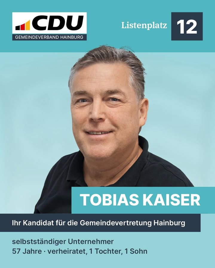 mehr👉 Weil es um Hainburg geht.Heute stellen wir Ihnen Tobias Kaiser vor ? Ihr Kandidat für die Gemeindevertretung Hainburg.Selbstständiger Unternehmer, 57 Jahre, verheiratet, Vater einer Tochter und eines Sohnes.Tobias Kaiser ist seit 2021 Gemeindevertreter und engagiert sich im Bau-, Verkehrs-, Wirtschafts- und Umweltausschuss sowie als stellvertretendes Mitglied der Betriebskommission der Gemeindewerke. Auch im Vereinsleben von Hainstadt ist er tief verwurzelt.Seine Fachgebiete:? Bau? Infrastruktur? UmweltDafür setzt er sich ein:? die infrastrukturelle Weiterentwicklung unserer Gemeinde? nachhaltige und sinnvolle Umweltprojekte? eine verantwortungsvolle Gestaltung von Bau- und EntwicklungsmaßnahmenMit unternehmerischer Erfahrung, Weitblick und Engagement für ein starkes Hainburg.Am 15. März 2026: CDU Hainburg.#WeilEsUmHainburgGeht #CDUHainburg #Kommunalwahl2026 #FürHainburg #TeamHainburg #Bau #Infrastruktur #Umwelt #GemeinsamFürHainburg