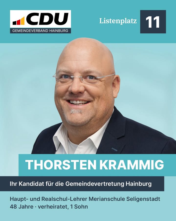 👉 Weil es um Hainburg geht.Heute stellen wir Ihnen Thorsten Krammig vor ? Ihr Kandidat für die Gemeindevertretung Hainburg.Haupt- und Realschullehrer an der Merianschule Seligenstadt, 48 Jahre, verheiratet und Vater eines Sohnes.Thorsten Krammig ist CDU-Fraktionsgeschäftsführer, Mitglied der Gemeindevertretung sowie aktiv im SJKS-Ausschuss und in der Brandschutz-Kommission. Auch im Vereinsleben von Klein-Krotzenburg ist er vielseitig engagiert.Seine Fachgebiete:? Digitalisierung? Bauen und Wohnen? Bildung und Inklusion? VereinsarbeitDafür setzt er sich ein:? barrierefreie Digitalisierung in unserer Gemeinde? eine kameradschaftliche Zusammenarbeit beider Hainburger Feuerwehren? bezahlbaren Wohnraum? den Neubau der zentralen Kläranlage? die Förderung der Hainburger Jugend und des Jugendraums? Inklusionssport und generationenübergreifende Projekte wie den Spiel- und Freizeitplatz am TriebwegMit Engagement, Fachwissen und dem klaren Ziel, Hainburg Schritt für Schritt noch lebenswerter zu machen.Am 15. März 2026: CDU Hainburg.#WeilEsUmHainburgGeht #CDUHainburg #Kommunalwahl2026 #FürHainburg #TeamHainburg #Digitalisierung #Inklusion #Jugend #Wohnen #GemeinsamFürHainburg