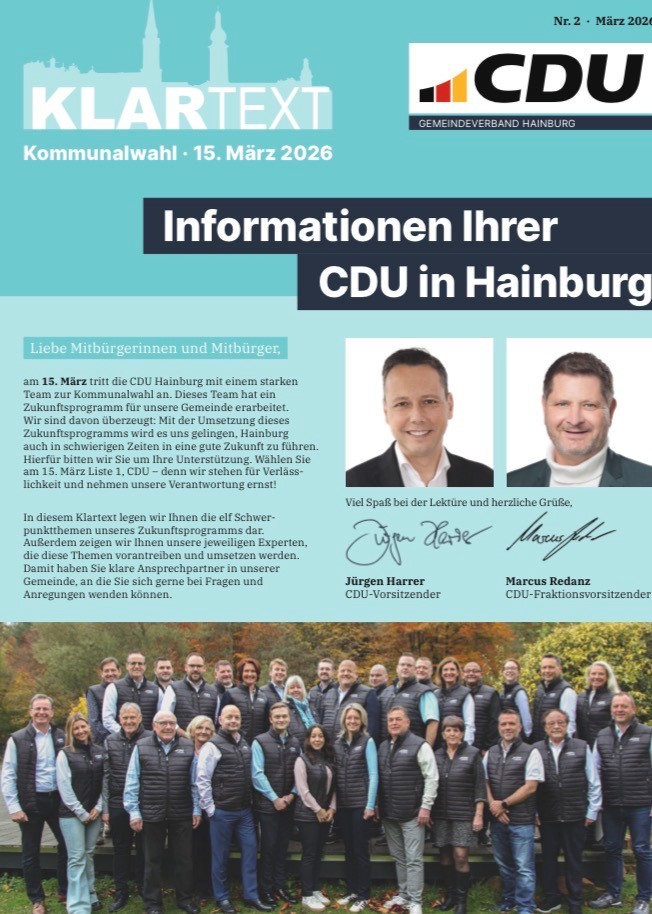 mehrKlartext reden! mit unserem hessischen Minister für Landwirtschaft und Umwelt, Weinbau, Forsten, Jagd und Heimat Ingmar Jung.Herzliche Einladung an alle interessierten Bürgerinnen und Bürger zu unserem traditionellen Bürgerempfang!In diesem Jahr freuen wir uns zudem auf einen musikalischen Gruß des Gesangsverein Germania.
